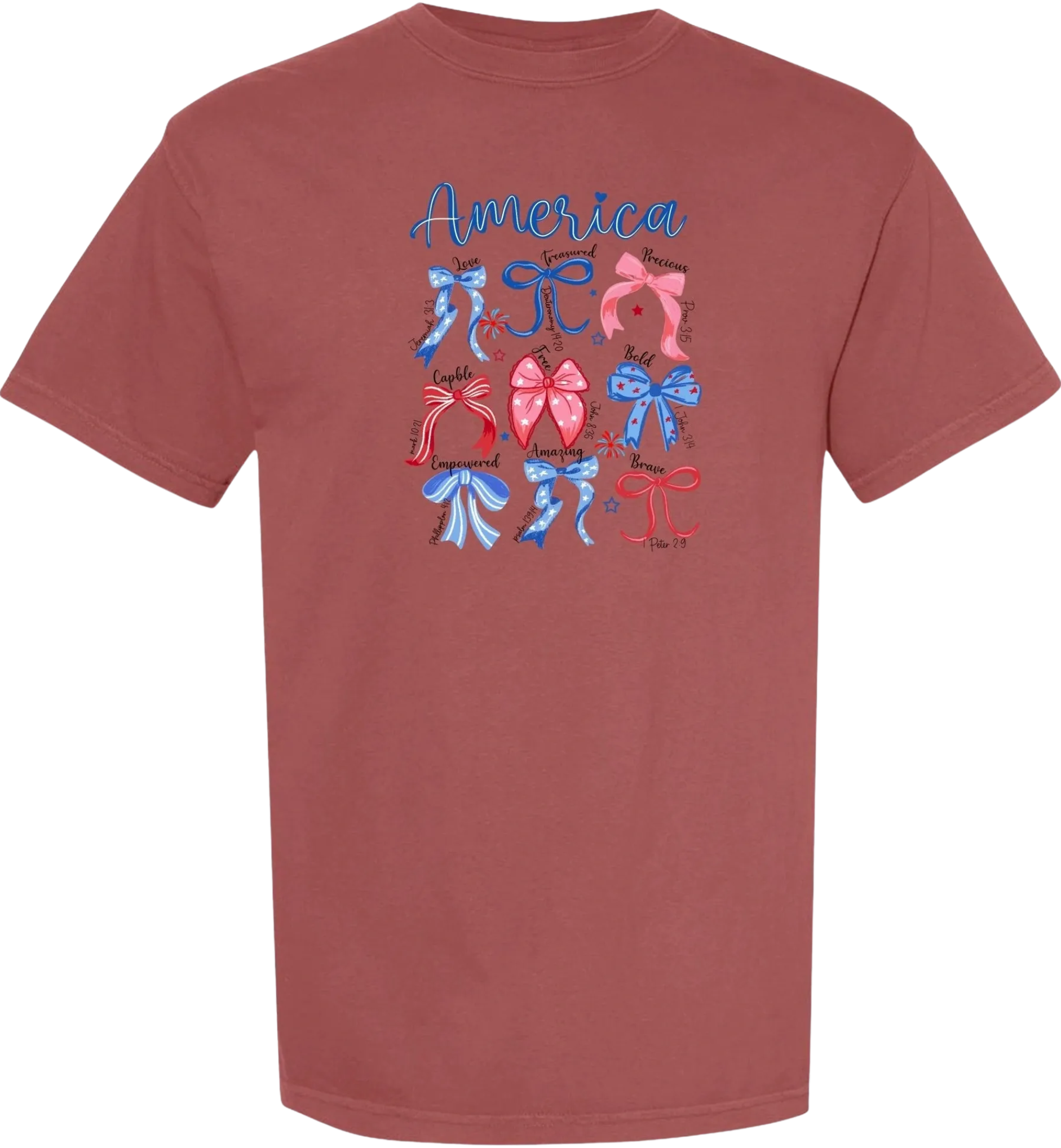This patriotic America Bows tee just in time for the 4th of July. Jump on this while supplies last. Comfort Color in 'Brick.' Garment-dyed for that lived in feel and almost no shrinkage at home. Soft ring-spun cotton fabric with 100% cotton threads. Relaxed fit.