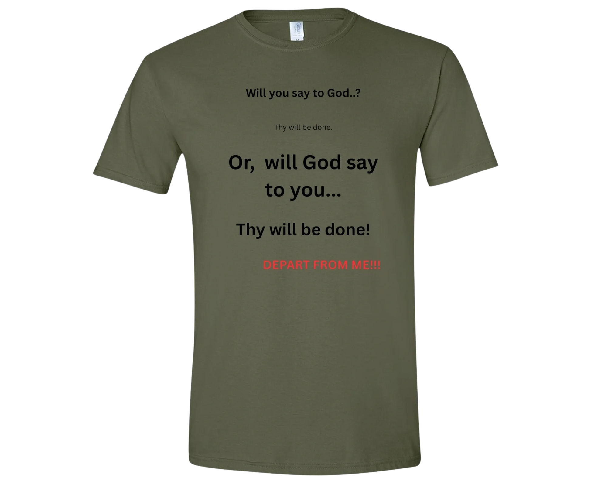 Depart from ME tee shirt is 100% ring-spun cotton on Military Green. With a sobering dialogue between oneself and God at the throne of judgement. What a bold and daring shirt to wear out for conversation starter.