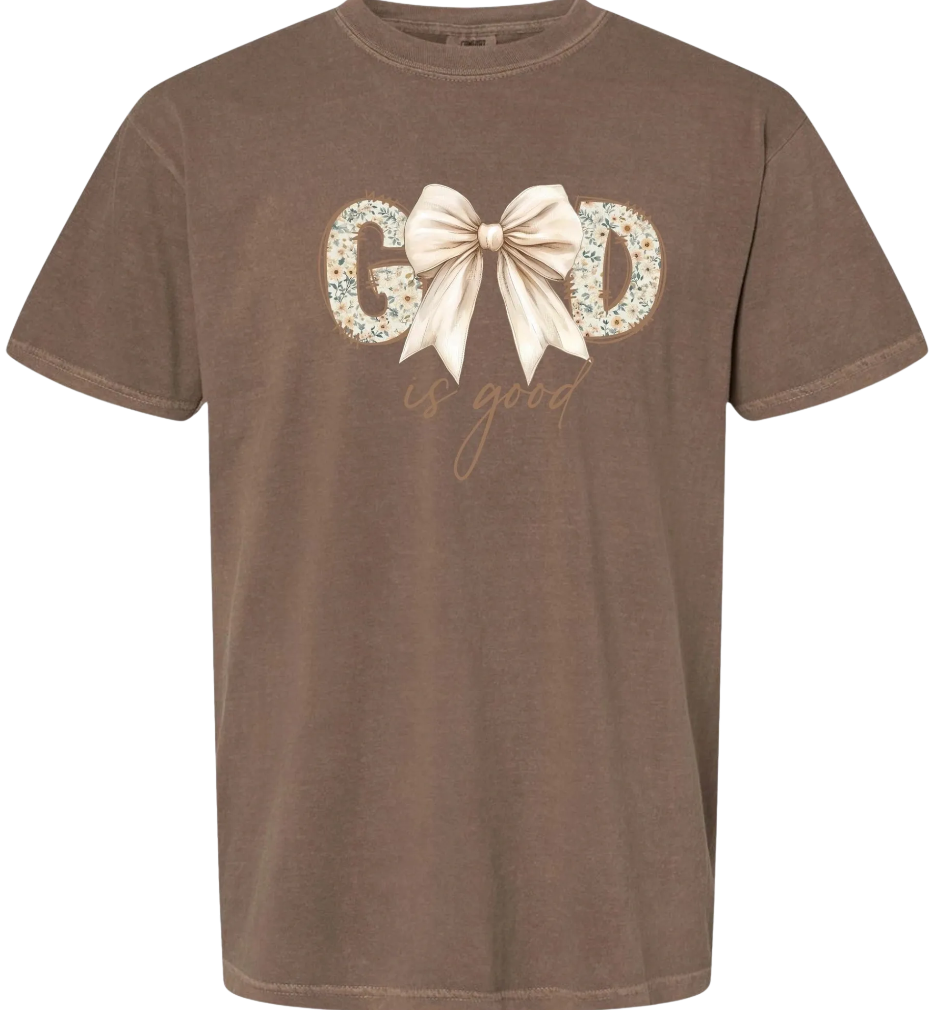 God is good with a bow on top. In expresso garment-dyed for that lived in feel and almost no shrinkage at home. Soft ring-spun cotton fabric with 100% cotton threads. Relaxed fit.