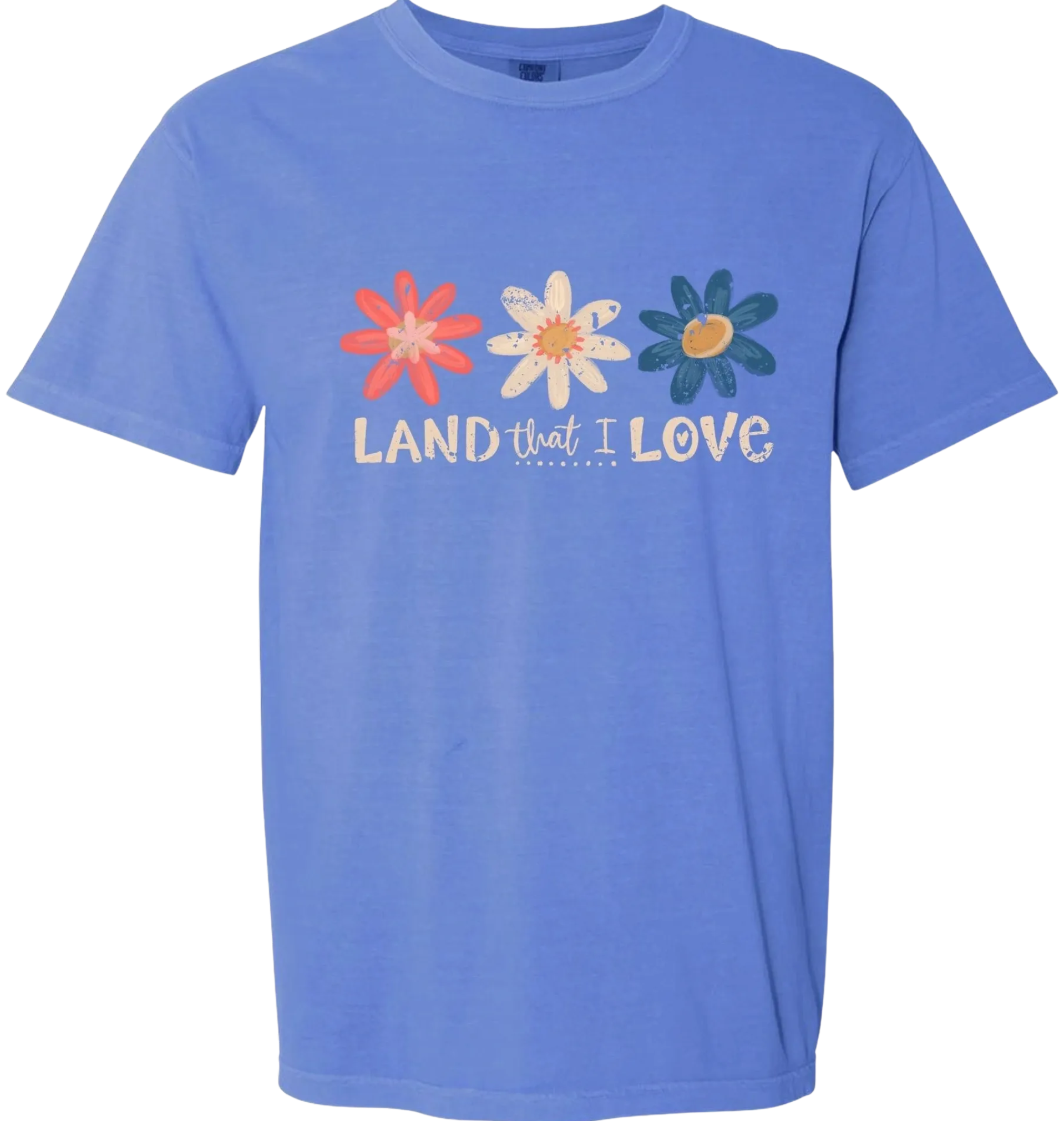 This distressed design on Flo Blue garment-dyed for that lived in feel and almost no shrinkage at home. Soft ring-spun cotton fabric with 100% cotton threads. Relaxed fit. What a wonderful and patriotic appeal.